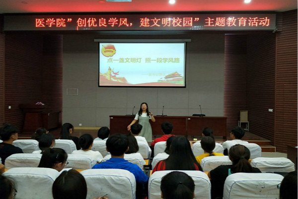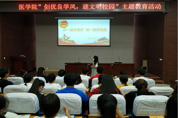 会议开始,副书记闫锐首先提出了学风建设的重要性,强调学风建设是提升大学品味的重要途径,是积淀大学文化的重要环节,好的学风需要大家一同建设,团支书及组织委员作为班级负责人更应起到带头作用,同时就文明校园的建设做出重要讲话,文明体现的不仅是个人素质,更是代表了整个医学院的精神面貌,这就要求团干部们要做到爱护公物,保护环境,尊敬师长,从身边的小事做起“勿以善小而不为”。副书记闫锐的表达丰富而不失重点,严肃而不失幽默,节节相扣,层层递进,赢得了全场的掌声。会议最后,副书记闫锐以本次会议的主题“点一盏文明灯,照一段学风路”为结尾,希望全体参会成员在日后的工作学习中能够铭记并切实实践。