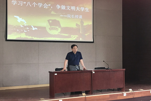 首先,郭传祯副院长从党的十八大以来,习主席对新形势下青年和共青团工作作出一系列重要论述简单介绍了“八个学会”主张的来源,点出党中央领导人对全体大学生的关心与爱护,以及当代大学生学习“八个学会”的必要性。表明让学生养成良好的行为习惯,提高学生文明素养,是构建文明校园的基础。同时也表明“懂礼节、正仪表、会交往”是高校大学生文明教育的基本要求,促使学生养成良好的行为习惯,培养道德品质高尚、行为举止完美的有气质、有修养且社会竞争力强的新时代大学生。郭副院长又通过自己的亲身经历教育同学们:作为当代大学生要学会劳动、学会勤俭,学会感恩、学会助人,学会谦让、学会宽容,学会自省、学会自律。体谅父母的不易、谨记老师的教诲,学会感恩,学会对别人说谢谢。郭副院长还号召同学们只有学会感恩,学会回报,才能不断得到提升,才能够升华自己,成为国家的栋梁人才。