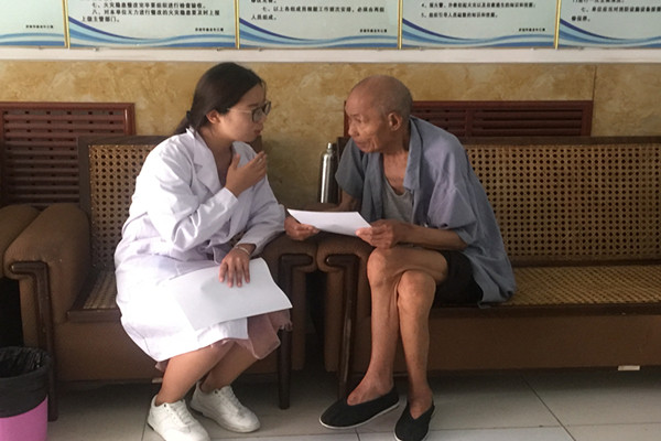 团队成员对内向老人进行一对一知识普及