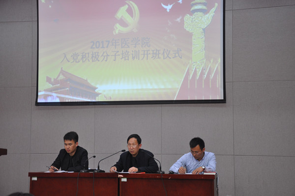 为了贯彻党的十八大精神,保持党的先进性,帮助入党积极分子学习党的知识提高对党的认识,提高入党积极分子的自身素养。医学院于2017年4月13日中午12:00在医学院学术报告厅1007室开展了“2017年医学院入党积极分子开班仪式”。医学院学工支部书记兼行政院长郭传祯、学工支部副书记兼行政秘书祝青山、学工支部委员徐善军以及全体辅导员老师出席了此次开班仪式。学生党员以及入党积极分子参与其中。