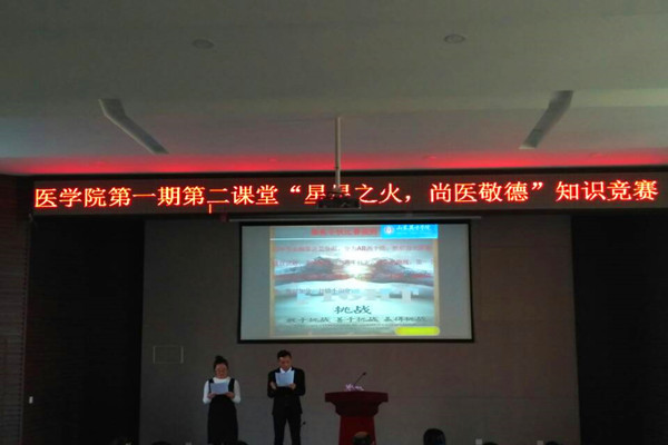 为配合我院的教学改革,丰富同学们的课余生活,激发同学们对专业知识的学习热情,在医学院领导、老师的大力协助下,由医学院学习部策划组织的以 “星星之火,尚医敬德”为主题的第一期第二课堂知识竞赛活动于2016122日下午13点在医学院1007顺利开展。参加本次活动的师生有医学院卢传华院长、教学副院长徐洪岩、教学秘书及部分专业课老师,行政秘书及部分辅导员、普本1501班学生、2016级各班班长、各班学习委员等。