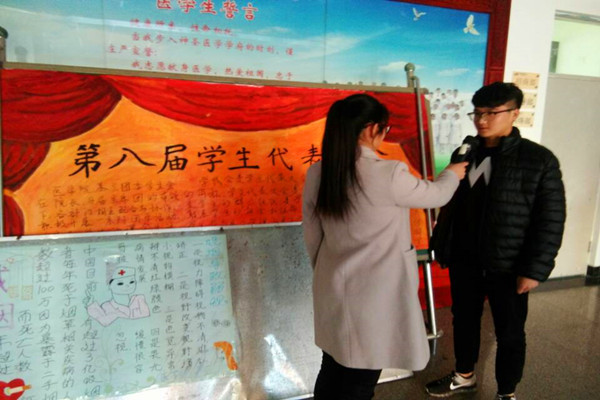 此次活动在医学院一楼大厅开始了面向全院同学的采访,学生记者通过:对学代会了解多少?自己理解的学代会是怎样的?召开学代会的目的是什么?如果你是学生代表应该怎样做?等一系列关于学代会的问题展开询问。学生们的回答非常精彩,学生们提出设立的自助取款机少、取款机的种类少,应该多设置一些农业银行、邮政储蓄银行等;宿舍晚上熄灯早,应晚熄灯一小时;早晚自习时却是一问三不知,不了解学代会、不知道学代会的职能是什么等。时间少,早晚自习应多加半个小时等问题和建议。采访到个别学生主持人向不了解的同学进行了相关知识普及,学生们都认真听了阐释,并做了笔记。