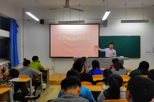 为了让学生们了解相关无偿献血的知识,动员全院学生加入无偿献血的队伍中去。2016年10月27日山东的英才学院医学院在全院范围内组织开展了“生命之源,让我们心心相连”无偿献血倡议会。此次会议由医学院祝青山老师主持、基层团委倡议召开,医学院全体班级参与了此次倡议大会。