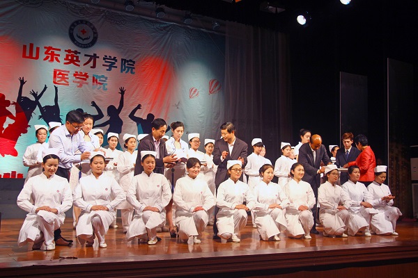 首先,张宗胜院长致辞,他代表学院向参加仪式的领导、全院护理工作者和护理专业的同学们送上节日的问候,并提出殷切希望。随后领导们给即将走上实习岗位的40名护理专业的学生带上圣洁的燕尾帽,传递了象征着圣火的蜡烛,在这神圣的时刻,有的同学还留下了激动的泪水。在宣誓人董百惠的带领下,在场全体同学起立,庄严宣誓,场面严肃。紧接着,郭传祯副院长宣读了护理技能大赛的获奖名单,对获奖的同学和指导老师进行了颁奖。