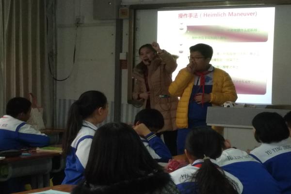 21日下午4点,王老师与服务志愿者走进育英中学初一(六班),王老师简单作介绍后切入正题,分别从排除气道异物,清理创面,溺水救助,触电解救等多个方面结合身边实际案例,新闻报道和影像视频,用通俗易懂的话语向学生们生动的讲解遇到此种危险该如何对他人施救和如何自救。随后观看了模拟人心肺复苏的视频,学生们聚精会神,表现出了极大的兴趣。讲解观看不如实际演练,过程中王老师邀请学生上台做排除气道异物的实际操作,学生们热情高涨,争先上台演练,台下学生们相互讨论,与老师亲密互动,也有细心学生将老师讲的重点知识记录下来,对于学生提出的生活中的自救疑问,王老师也做出了详细的解答,并纠正了在生活中的许多错误做法,最后,王老师语重心长的叮嘱大家:急救措施在平常是绝对不可在正常同学身上使用的,只有当遇到紧急危险时,避免自身和他人伤害时才可使用。