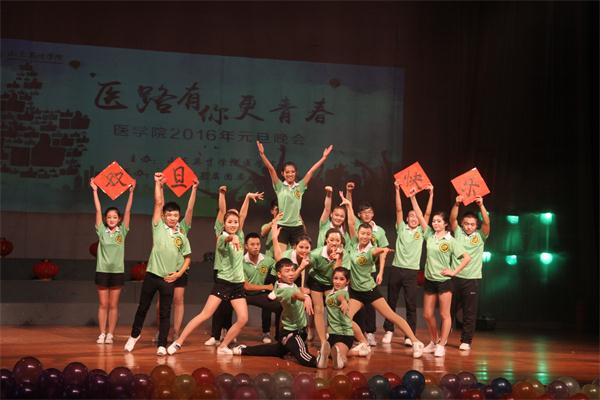 精彩的节目在热闹的开场舞中拉开帷幕,调动了全场热烈的气氛,绚丽的灯光下,舞动着一张张朝气蓬勃的笑脸,伴随着热烈的掌声,第一篇章:青春献礼。一段柔美古朴的吉他弹唱吸引了所有人的注意力,歌声婉转动听,节奏紧凑;伴随着所有观众的呐喊声,由吴卓等人表演的舞蹈《吉娃娃》显现在观众面前,展现了医学院学子积极向上的态度;医学院办公室部长刘世澎和艺术团团长张悦的小品《麻辣女医生》诙谐的语言,搞笑传神的动作,无不感染在场的所有观众,展现出医学院学子对生活的热爱;健美操《感到幸福你就拍拍手》展现了15级班长团支书这些日常默默的付出者的动感活力;由马海英、张圣等人演唱的歌曲串烧歌声婉转动听,节奏紧凑。