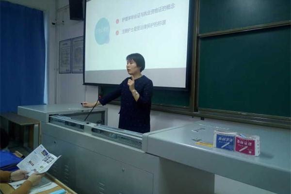 孙美岩部长首先以“了解国际护士证吗”这个问题拉开了报告会的序幕。孙部长虽然是一名卫校毕业的学生,但是在国内从事护理工作两年,在沙特工作七年,她用自身经历开始向大家阐述了只要好好努力把握机会成功很简单的道理。然后,孙部长分别从注册护士证的必要性、注册护士证误区、注册护士证途径、如何准备四大方面讲解了护士证在国外如何单独注册和在外派护士的工作情况、待遇和收获等。最后,孙美岩部长根据在座同学制定了职业规划模板,希望同学们能够抓住机会,愿大家的护士职业生涯无限美好。