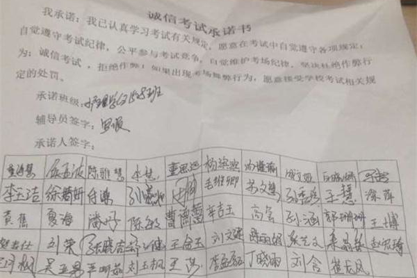 辅导员利用主题班会的形式开展诚信教育,通过收集身边可能出现的违反诚信考试的不良行为,深入分析违规考试的原因和危害,探讨改正的途径与方法,同时号召同学们互相提醒,互相督促。提倡踏实、严谨的求学态度,培育诚实、守信的做人品质。把纪律要求和道德规范内化为自己的信念,外化为自己的实际行动,让舞弊远离校园,让诚信常驻心中。班会结束后,大家还签订了诚信考试承诺书,每位同学都郑重承诺,将从自身做起,严格要求,用实际行动营造了良好的学风、考风,塑造新时代大学生形象,努力创建纯洁公正的医学院良好作风。