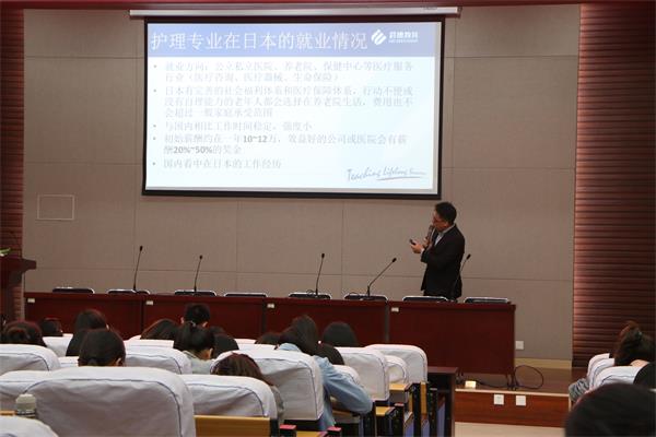 主使人孙老师用简洁明了的语言说明大学生毕业后的多种去向,有直接找工作、考公务员、创业、考研究生、出国留学等。出国去日本留学不要因为资金而放弃,具体留学方面由主讲人王老师进行讲解。王腾蛟老师首先教给了同学们简单的日语,使同学们对日语增加了兴趣,然后他简单介绍了自己,在日本上了一年大四和三年研究生,并工作了两年,六年时间使自己变成了全新的一个人,付出和回报是成正比的。然后,王老师分别从日本就业形式.护理专业在日本的就业情况、赴日后的出路、赴日留学和工作需要做的准备、日本的生活五个方面讲解了日本留学与就业情况。在日本居住环境舒适,交通方便,工资高等优点,留学回国找工作也会很轻松。最后,王老师介绍了日本多处旅游景点,世界很大应该多出去走走,希望同学们能够抓住机会,提升自己拥有更美好的未来。