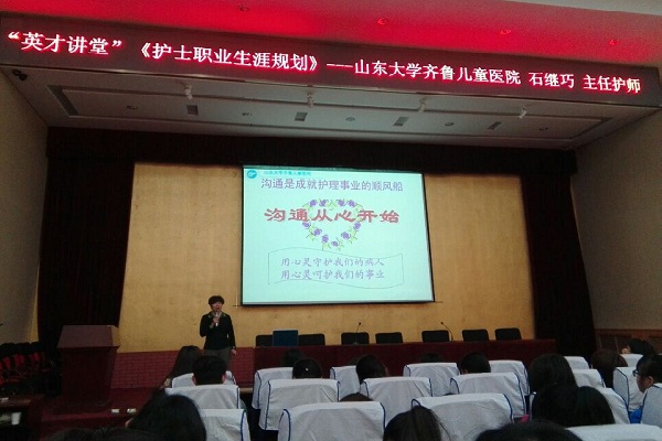 在护士节来临之际,为了护理专业同学更好的了解相关知识及职业生涯发展,医学院于2015年5月11日下午14时,在必赢bwin线路检测中心南校区学术报告厅举行了“英才讲堂”―《护士职业生涯规划教育》报告会。本次报告会的主讲嘉宾是山东大学齐鲁儿童医院石继巧主任。参加本次报告会的有医学院就业副院长李萍、医学院基层团委书记张巧梅以及护理专业同学。