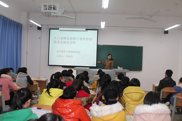 随着国际及国内人口老龄化趋势的发展,社会对人口老龄化问题也日益关注,作为一所应用型的本科院校,为适应社会发展需求,加快学院全面建设,医学院(老年服务与管理学院)于11月26日在医学院1008教室组织开展了“人口老龄化形势下老年护理需求及就业分析”的专题讲座。主讲人是刘延利老师,刘老师曾在养老机构中成长发展,有着丰富的实践经验,并发表期刊论文、会议论文多篇。