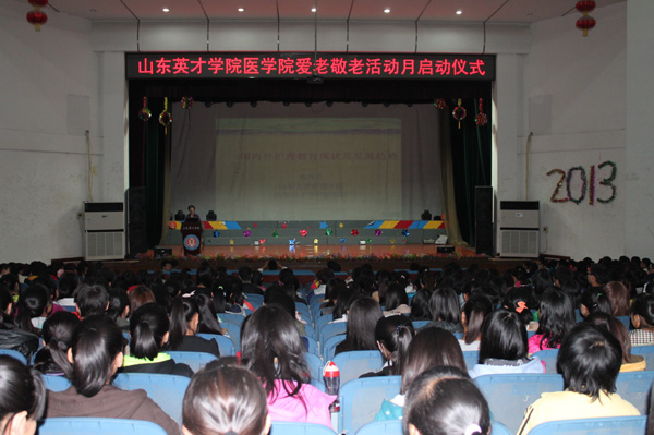2013年10月13日是中华民族的传统节日--“重阳节”即“老年节”,为更好的弘扬尊老敬老的传统美德,提高广大大学生爱老敬老的意识,增强大学尊老爱老理念。以九九重阳节为契机,医学院(老年服务管理学院)决定将今年的十月份定为“爱老敬老月”。10月16日中午,医学院(老年服务管理学院)在大学生活动中心隆重举行爱老敬老月启动仪式暨护理专业教育主题讲座活动。本次讲座邀请了山东大学博士生导师娄凤兰教授担任主讲,医学院教学秘书王世芳、基层团委书记高强、全体辅导员老师以及900余名大一新生参加了本次讲座,讲座由郭传祯副院长主持。
